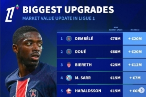 法甲身价更新升值榜:登贝莱&杜埃均上涨2000万欧,比雷斯在列
