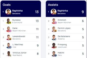 虽然未能进入欧冠决赛,但拉菲尼亚双榜领先优势较大,很有希望包揽欧冠金靴和助攻王。